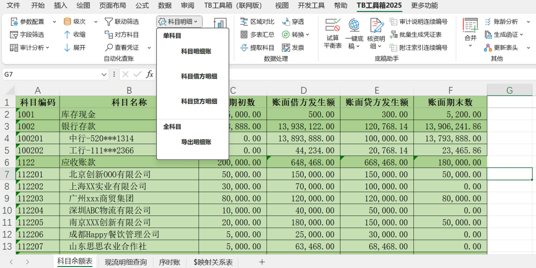通过序时账生成现金流量表,其实很简单! 一、主要思路 1.首先,通过序时账筛选出库存现金和银行存款涉及的分录,进而获取现流明细表; 2.接着,在现流明细表增加一列,根据业务性质判断并填充每一笔明细对应的现流主表项目; 3.最后,按主表项目汇总金额,即可生成现金流量表。 为了进一步提升审计效率,“TB工具箱”提供了一套完整、系统的解决方案,帮助您快速、准确地完成现金流量表编制。 二、操作指南 1.获取现流明细表 可以展开“科目明细”下拉菜单,点击“科目明细账”;在弹出的对话框,输入100,即可从序时账获取1001库存现金和1002银行存款的全部分录。