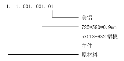例:物料代码“01.01.001.001.01”代表“725*580*0.9mm规格 5XCT3-H32材质的 铝板”。 例:物料代码“01.02.005.003.02”代表“每二套模具生产的 黑色左边的 压铸工艺加工的TUMI包角”。