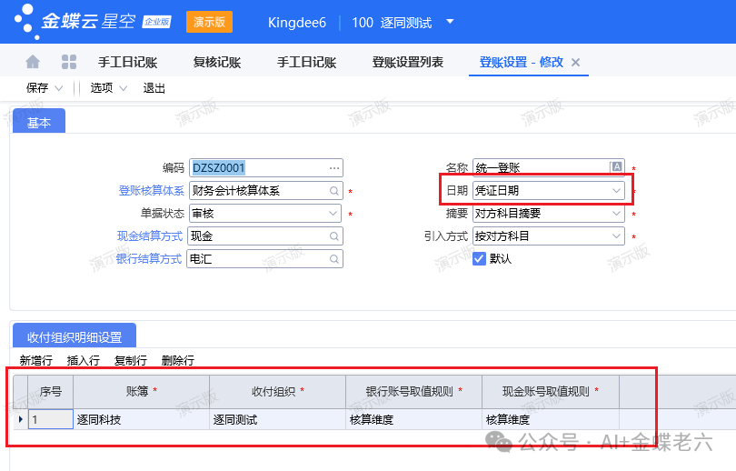 2.登账设置:按核算维度的设置,注意登账设置的日期为凭证日期: