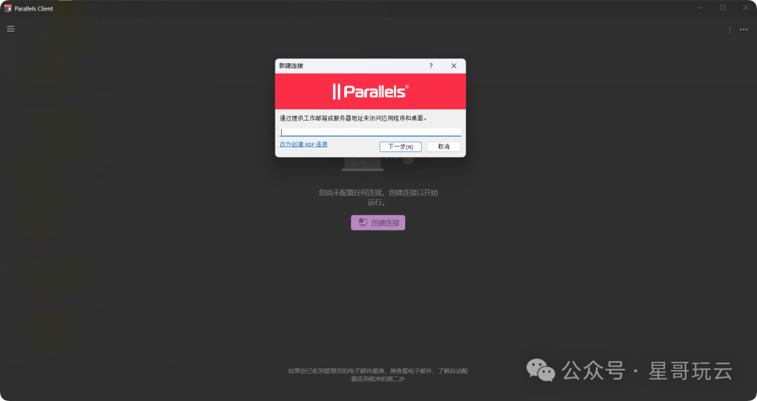 1.打开Parallels RDP Client后,按下快捷键Ctrl + N新建会话,默认是Parallels自身的协议,我们可以选择“改为RDP连接”