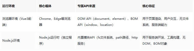 二、为什么有些npm包适配Vue3,有些只适配Node.js?这个问题的核心答案的是:npm包的适用场景,由它所依赖的“运行环境API”决定。Vue3项目和Node.js的运行环境完全不同,二者支持的底层API不互通,这就导致了包的兼容性差异。 首先我们明确两个核心运行环境的区别: 需要特别注意:Vue3项目并非完全脱离Node.js——开发和构建阶段(比如运行npm run dev、npm run build),Vue3的配置文件(如vite.config.ts、vue.config.js)是运行在Node.js环境中的;