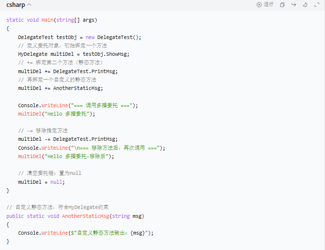 这是委托最强大的特性 ——一个委托对象可以绑定多个方法,形成委托链,调用委托时会按绑定顺序依次执行所有方法。