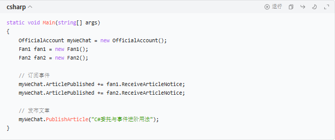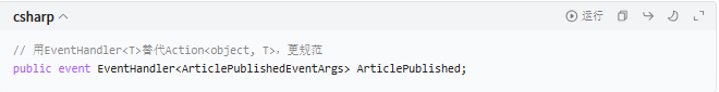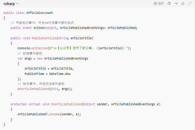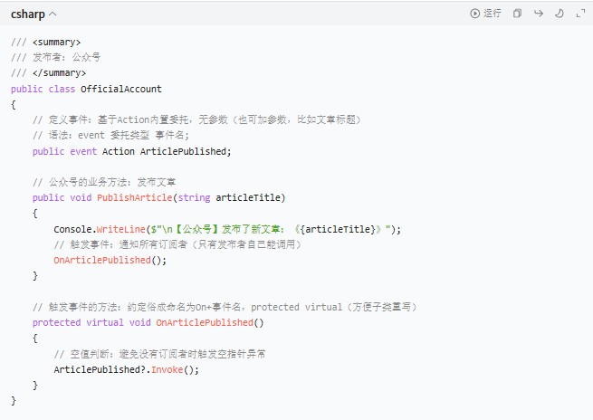 2.外部无法直接调用事件:只能由发布者自己在内部触发(比如示例中的OnArticlePublished方法),保证触发逻辑的可控性;
