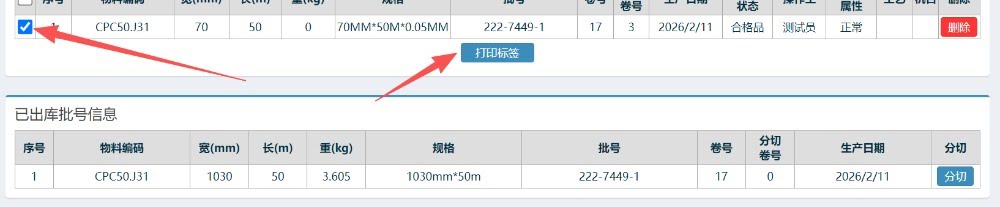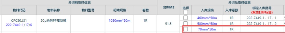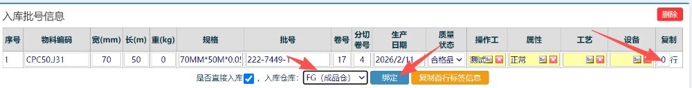 进入界面后,点击“分切”按钮,复制对应的标签数量,选择对应的入库仓位,点击绑定按钮,完成