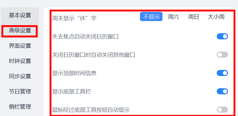 4、点击设置按钮,可以设置是否开机运行,是否显示农历、节日等信息。