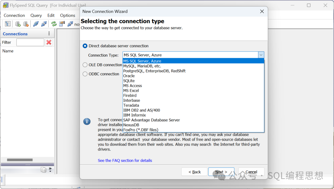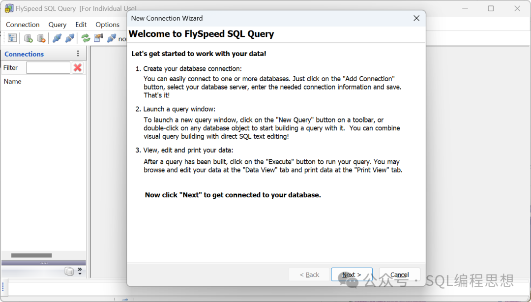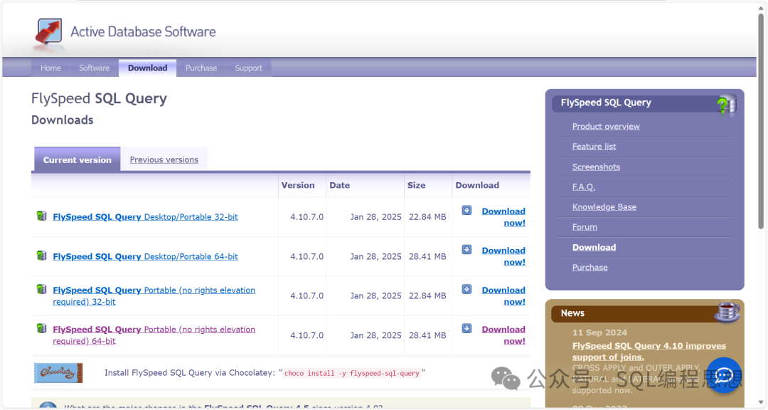 可以选择 64/32 位安装包进行下载,安装完成之后运行 FlySpeed SQL Query.exe: