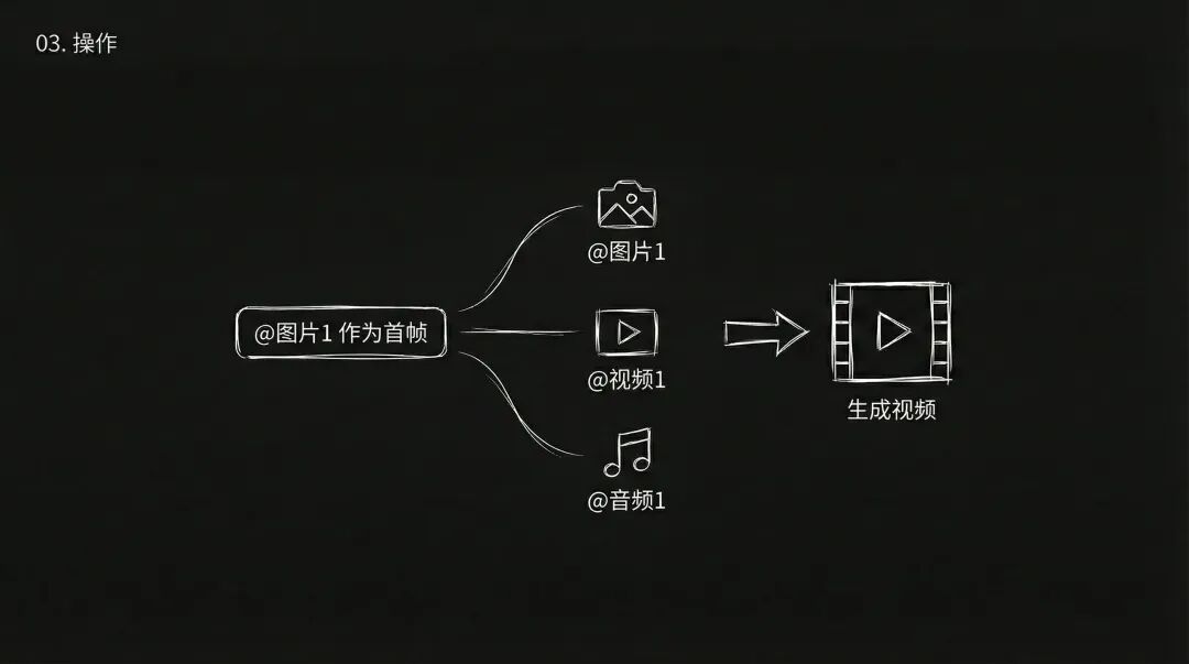 第三步:用"@"给每个素材分配任务(最关键)这一步是 Seedance 2.0 最核心的操作,也是很多新手容易忽略的地方。 上传完素材后,你需要在提示词里通过 @素材名 来告诉模型,每个素材具体干什么用。模型不会自己猜,你不说清楚,它就可能乱用。 比如: