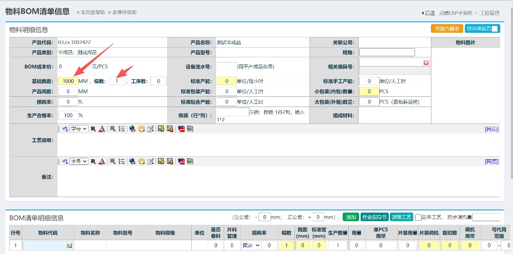 进入到编辑页面后,输入固定的跳距,模数,跳距固定为1000,模数为1,如下图所示: 固定跳距模数原因说明:由于半成品为卷料,单位固定为M2(平方米),因此设置材料比例为1比1设置。