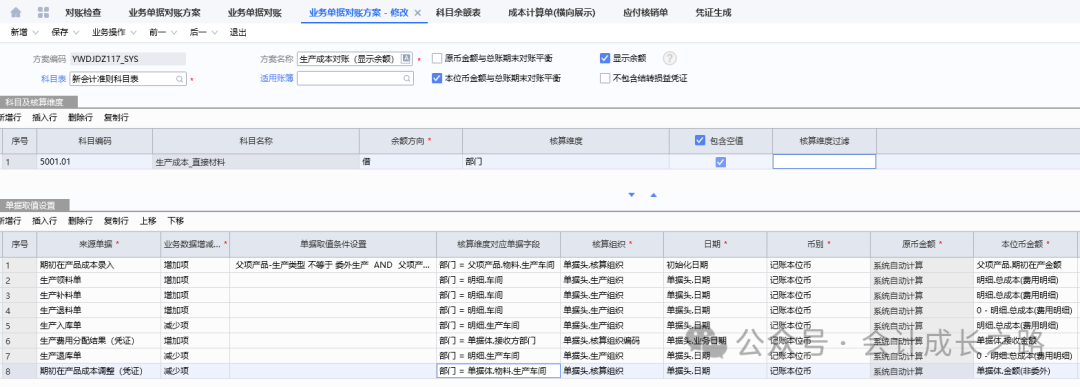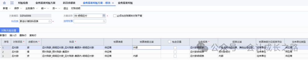 今天讲讲金蝶云星空结账流程中第20步对账工作,有2种方法:将科目余额表和对应单据明细导出来手工核对;还有一种是利用系统的对账功能。下面我们详细讲讲系统对账功能的使用。之前都是手工核对,这个功能今天刚学习才开始启用,第一次设置会经常出现对账结果不平衡,需要反复修改对账方案。建议先手工核对一遍,有了对账结果,再使用设置的对账方案对账,这样差异在哪里,怎么调整对账方案就有思路了。1、暂估应付对账(科目余额表应付暂估余额与应付未开票明细表余额核对)金蝶入口:财务会计-智能会计平台-业务报表对账方案;财务会计-智能会计平台-业务报表对账-选择对账方案-勾选包含未过账凭证-对账-对账结果-不平衡的去查原因解决。一般差异由手工凭证造成差异,正常情况走模块对账基本平衡。- 比如成本调整单调整:在供应商发票未入账之前,发现采购合同单价远高于往期结算价导致暂估应付单中存货金额偏高,而采购又不退货重下订单,此时为了存货金额不受影响,做了成本调整单(借:应付账款暂估,贷:原材料)。