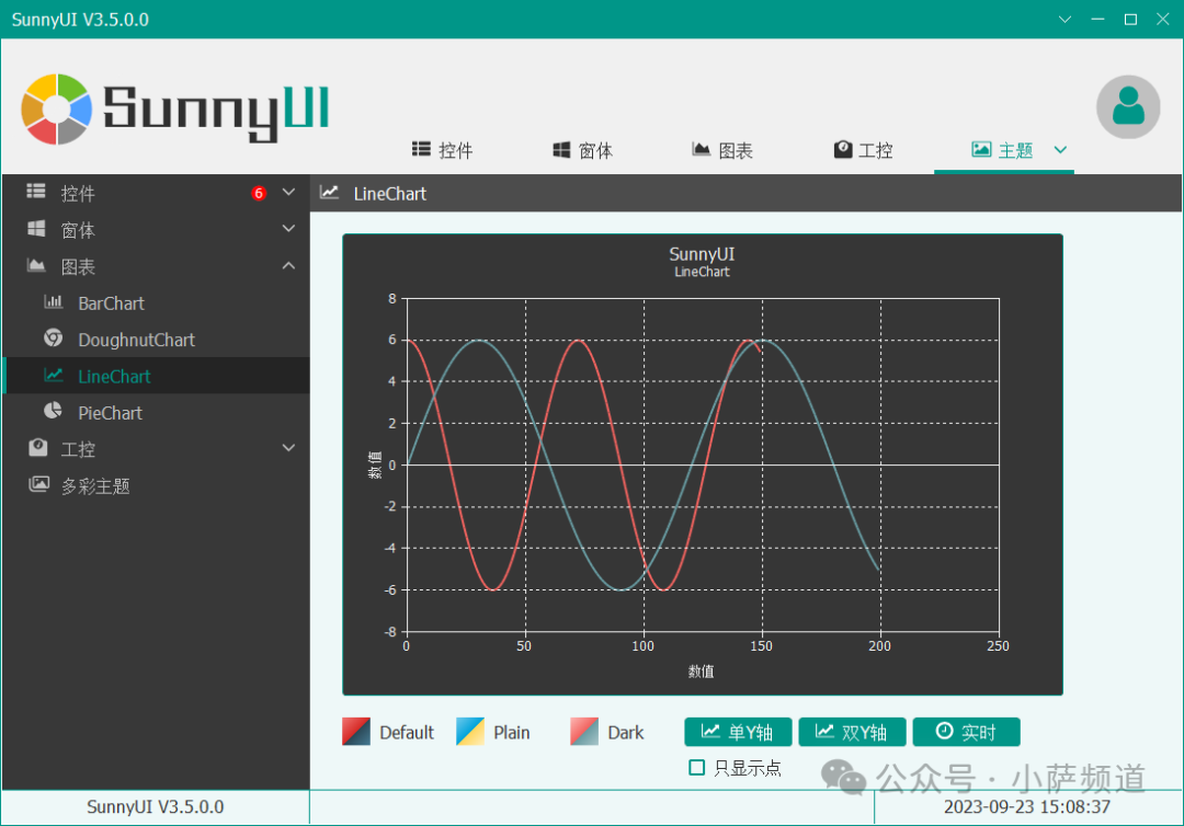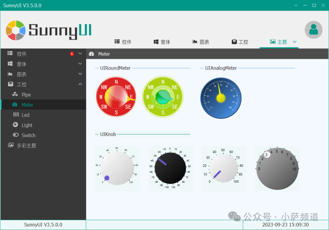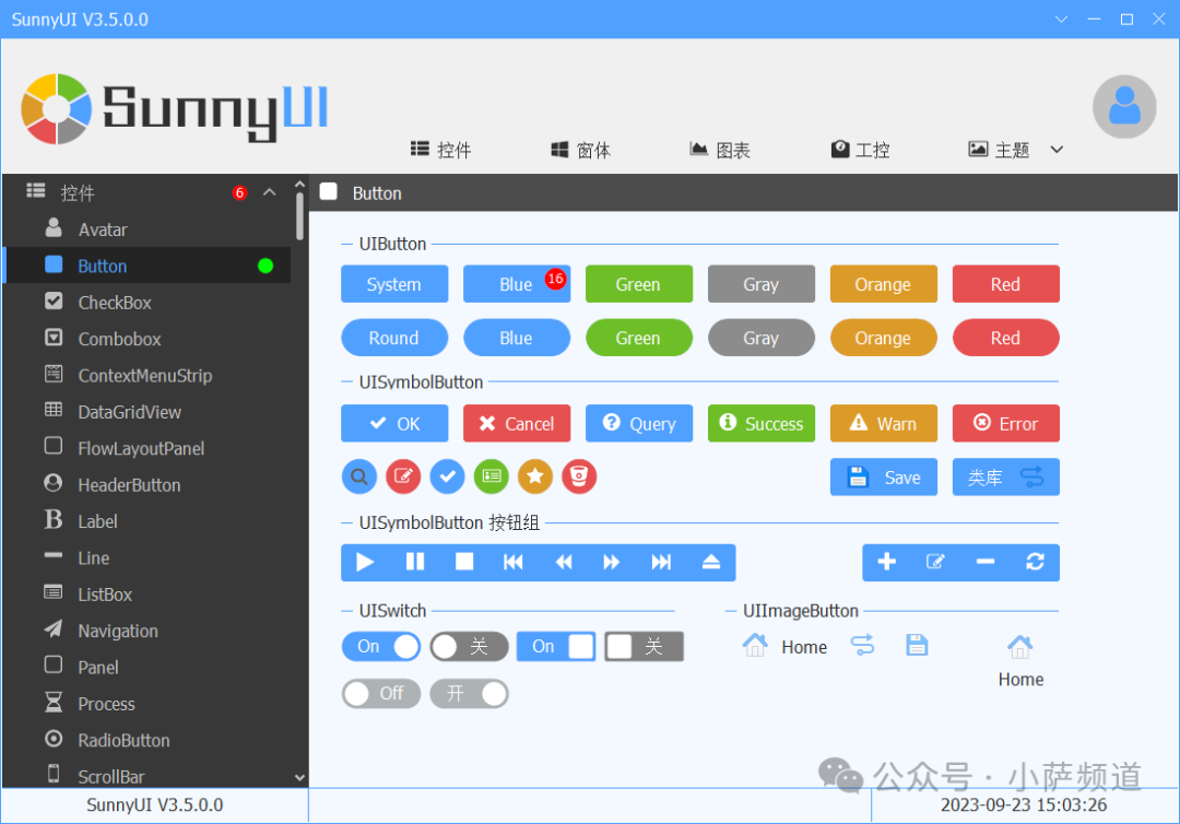 SunnyUI 内置了 17 套主题风格,包括蓝色、绿色、红色、紫色等常见配色,以及一套从 Element UI 借鉴而来的设计语言(所以叫 SunnyUI)。用起来只需要一行代码: