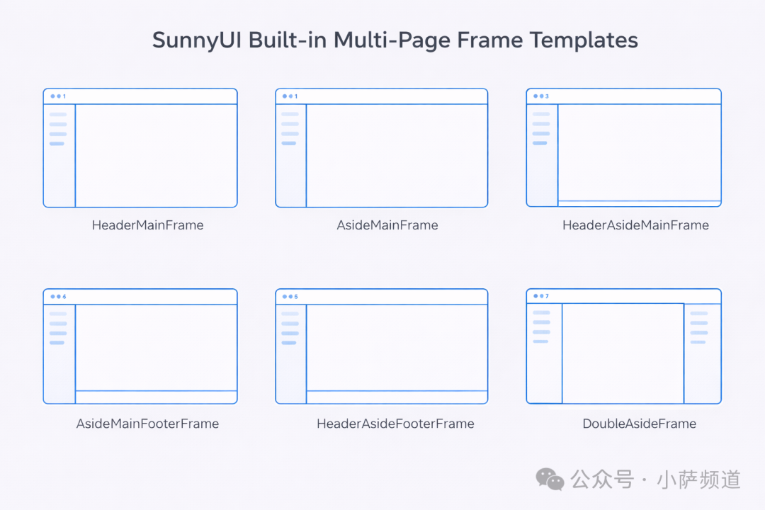 这是 SunnyUI 最被低估的功能。它内置了 7 种多页面应用框架模板,参考了 Element UI 的页面组织方式,主frame + aside 导航 + 内容区,配合 UIPage 基类管理页面的初始化和销毁。
