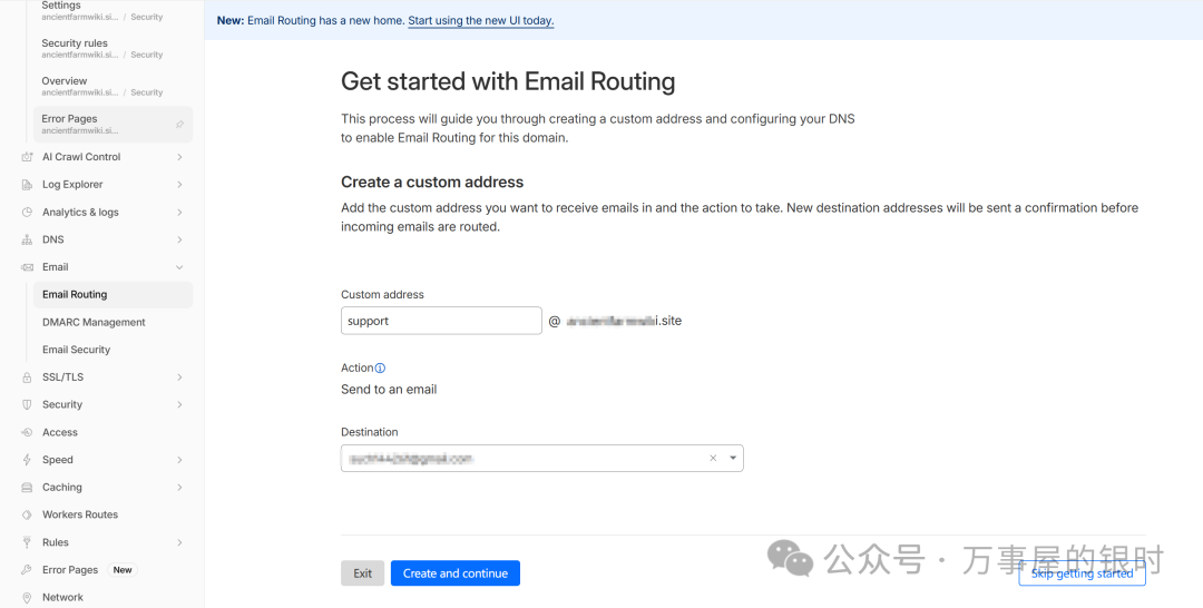 首次进入点「开始使用」,Cloudflare 会引导你完成配置,自动添加必要的 MX 和 TXT 记录,不需要手动操作 DNS。