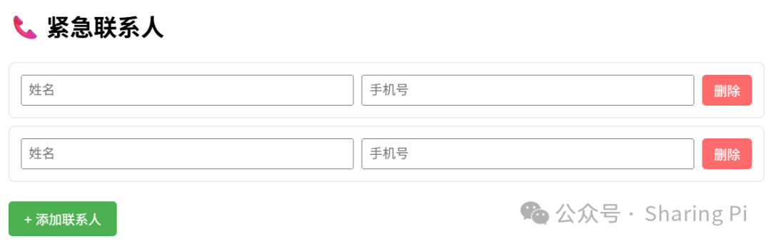 <h2>📞 紧急联系人</h2><div id="contacts-container"> </div><button class="add-btn" id="addContactBtn">+ 添加联系人</button><template id="contactTemplate"> <div class="contact-group"> <input type="text" placeholder="姓名" class="contact-name"> <input type="tel" placeholder="手机号" class="contact-phone"> <button class="remove-btn" type="button">删除</button> </div></template>