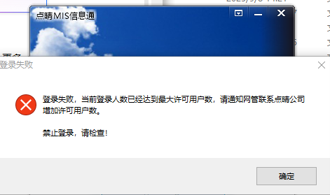 点晴MIS/OA信息通提示登录失败:当前登录用户数已经超出授权数,请联系点晴公司增加授权数!如何解决?点晴MIS信息通PC客户端