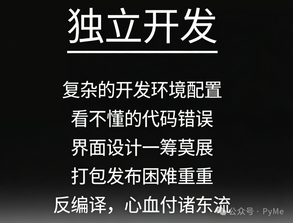 如果有一个工具,能保留Python的所有优点,同时完美解决上述痛点,会发生什么?这正是PyMe诞生的初衷——“让每个有想法的人都能成为独立开发者”。