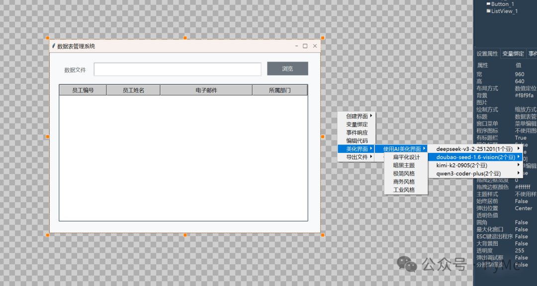 PyMe深度集成大语言模型,支持在代码编写时调用大模型来基于上下文生成代码,也支持在完成界面设计后通过大模型美化界面,大大降低开发和设计门槛。为软件产品的快速完成提供智能保障。