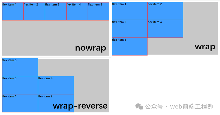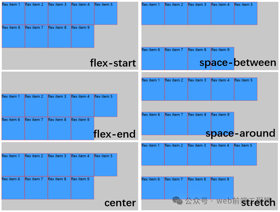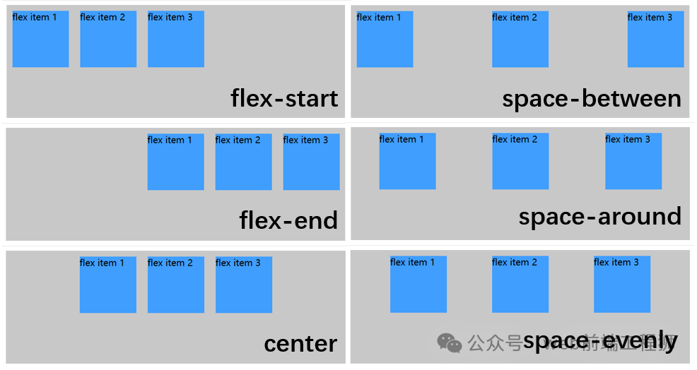 space-between:两端对齐,项目之间间隔相等space-around:项目两侧的间隔相等,首尾项目与容器边缘的间距是项目之间间距的一半space-evenly:项目之间间隔相等,首尾项目与容器边缘的间距也等于项目之间间距