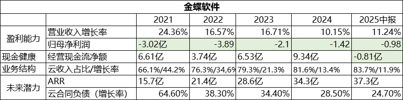 这个指标是之前一位湖北陈姓用户建议观察的。季节性波动的中报外,年度经营现金流持续改善且强劲为正(24年达9.34亿),极大程度打消了市场对其“烧钱续命”的担忧,证明其云订阅模式具备了强大的自我造血能力,意味着金蝶拥有更充足的资源和时间来完成转型。