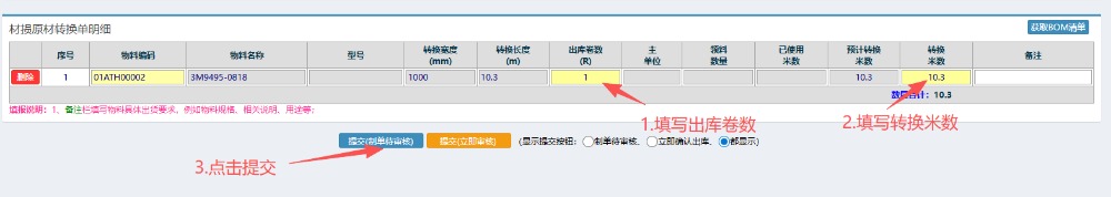 3.选好物料后,填写出库卷数以及转换米数,然后点击提交(根据情况选择“待审核”或“立即入库”)