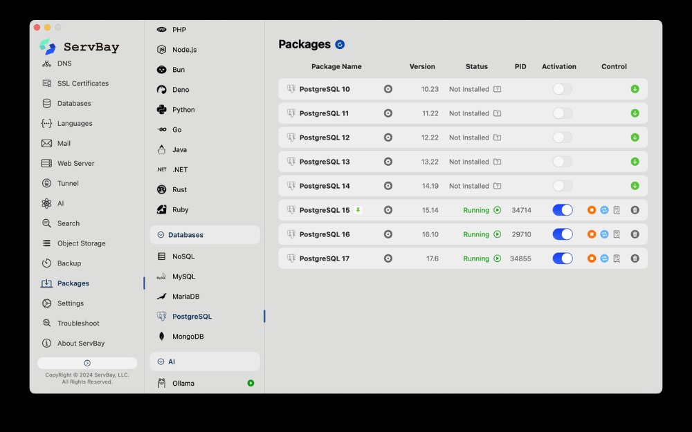 这就是 ServBay 的价值所在。ServBay是一个集成了Web开发所需各种软件的本地环境。对于数据库选择来说,它带来了极大的便利