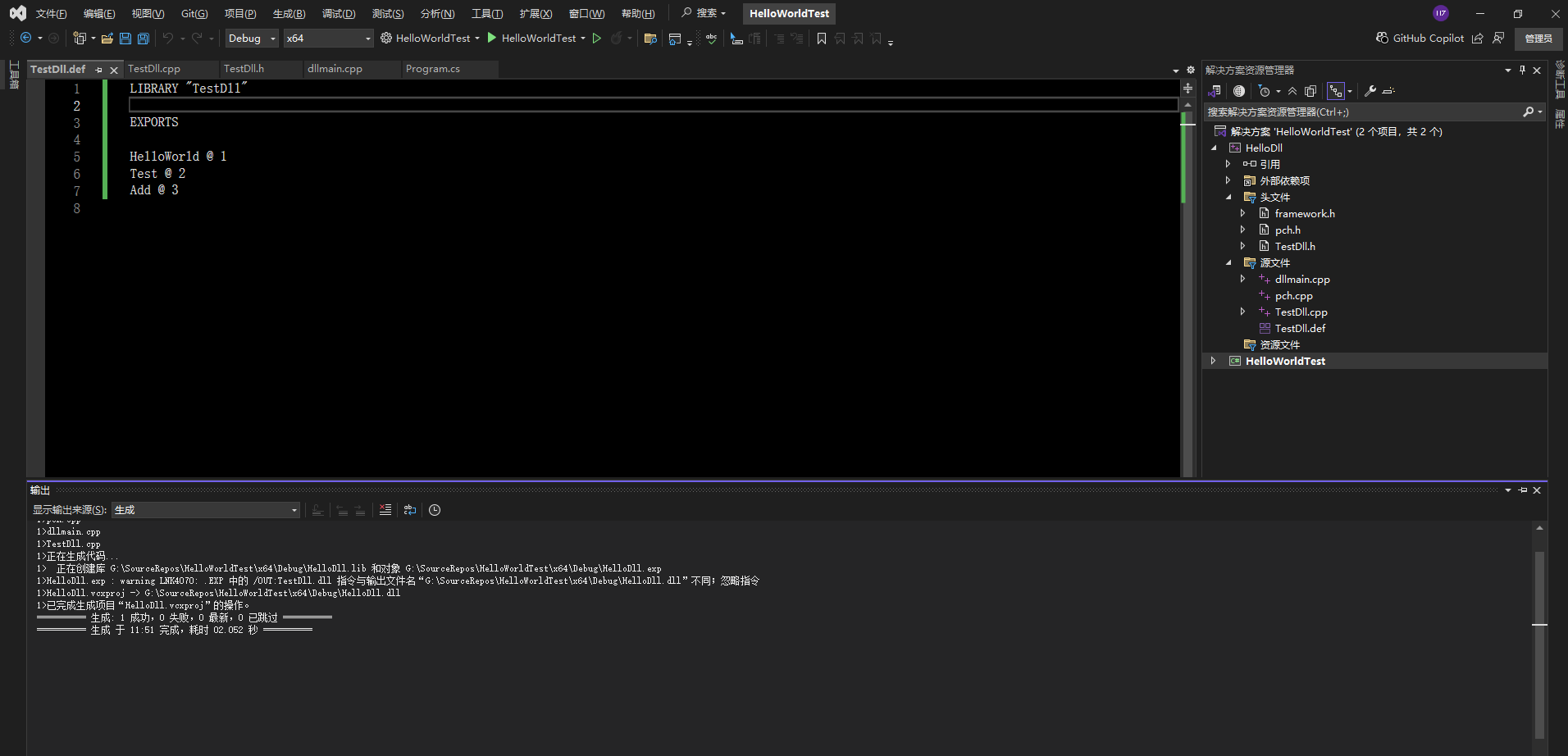 编译生成dll。这里需要注意的是,如果生成是64位的库,C#程序也要是64位的,否则会报错
